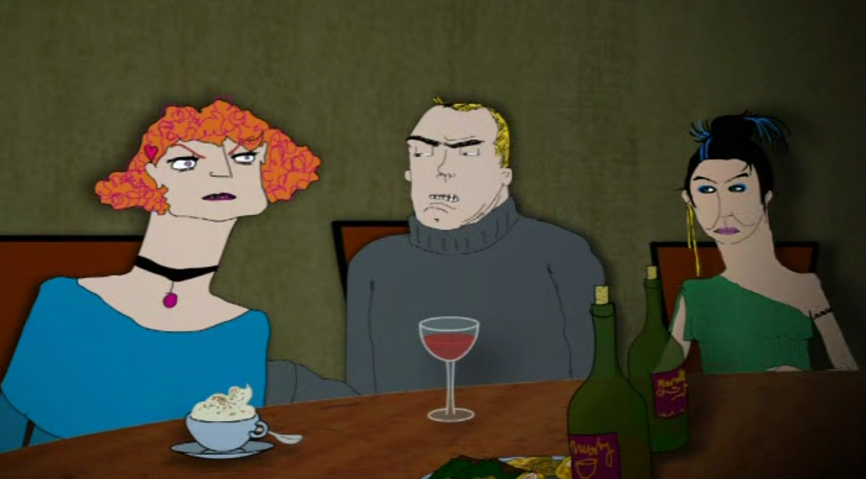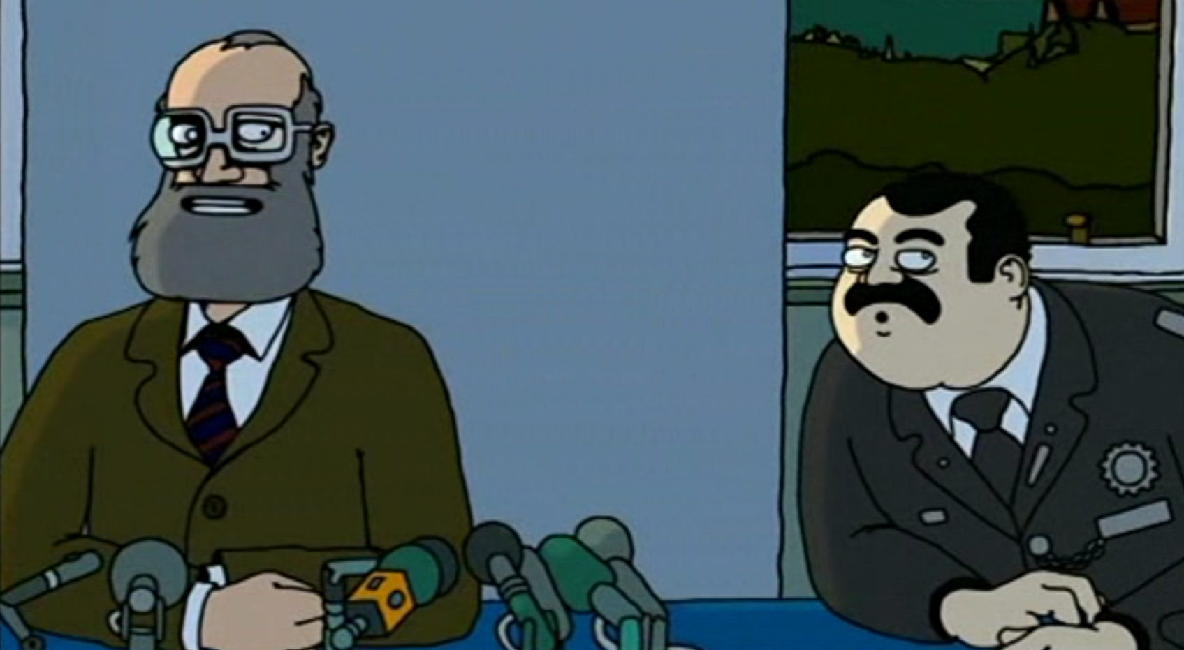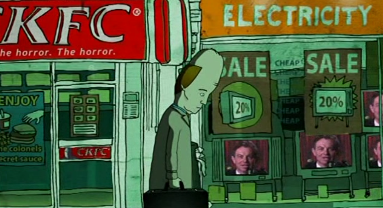 On paper, Monkey Dust was a sketch show: animated shorts stitched together in a half-hour slot. In practice, it was closer to a cultural séance. Recurring figures weren’t really characters so much as avatars of decline: Omar and his West Bromwich terror cell carefully planning jihad around Stars in Their Eyes and Angel Delight; Ivan Dobsky, the “Meat-Safe Murderer,” forever insisting he hadn’t done it; the Paedofinder General, spotting paedophiles in Fiddler on the Roof or a boy playing with his dog; the Homeless Poet mumbling bleak laments into the void; the coke-addled media executive raving at warp speed; and Jerry Berman, the sleazy PR man, forever rebranding disgrace into “opportunity.”
